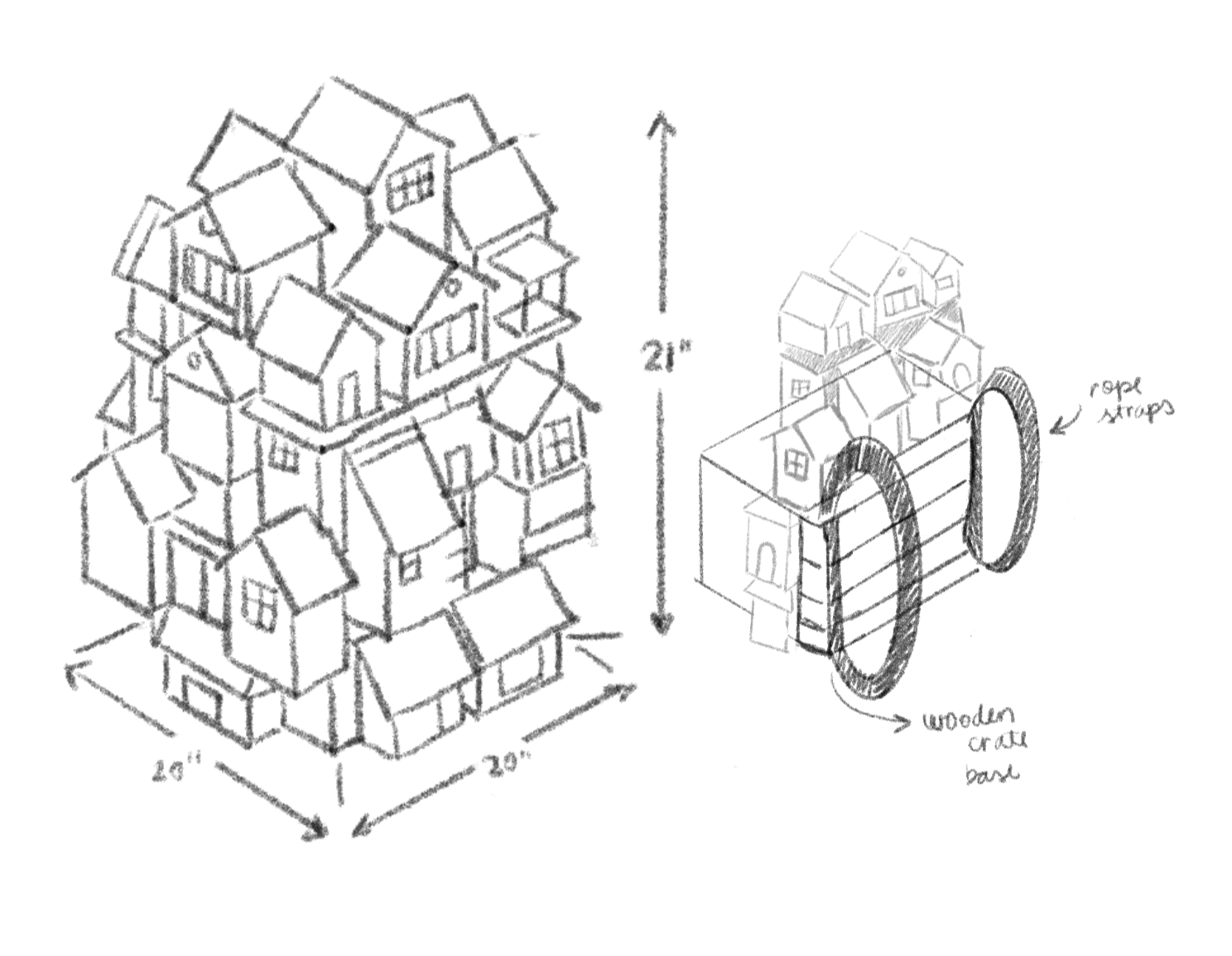 A backpack made of miniature houses stacked on top of each other. The design of it, is a geography that feels familiar to the artist: the way houses in the Brazilian morros and favelas grow upward and outward from each other, one on top of the other, the community itself becoming the architecture. To carry the backpack is not only to carry a house, it is to carry the hill it sat on, the neighbors whose walls it touched. The immigrant body moves with all of that strapped to its back- roots still dangling, not yet replanted.