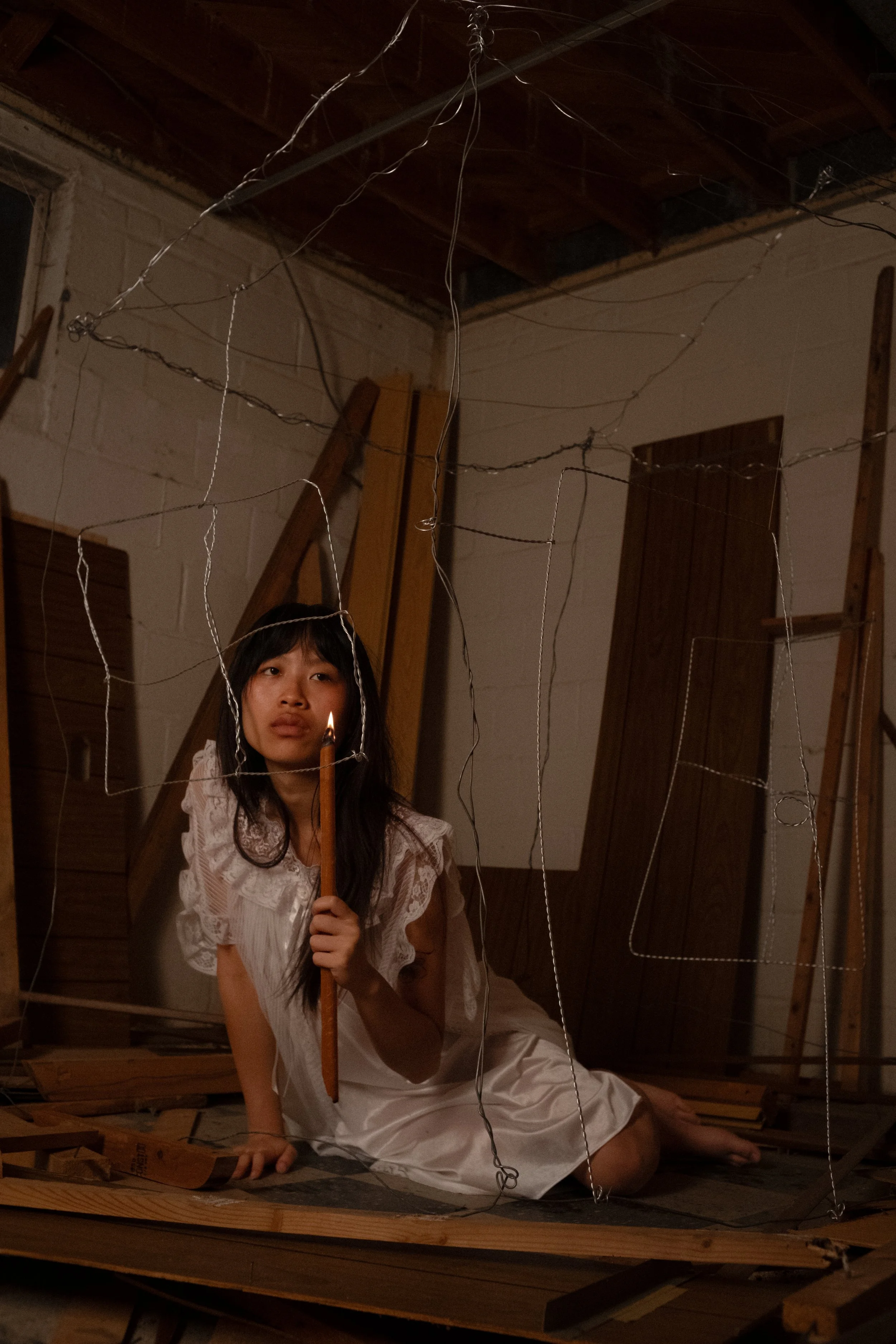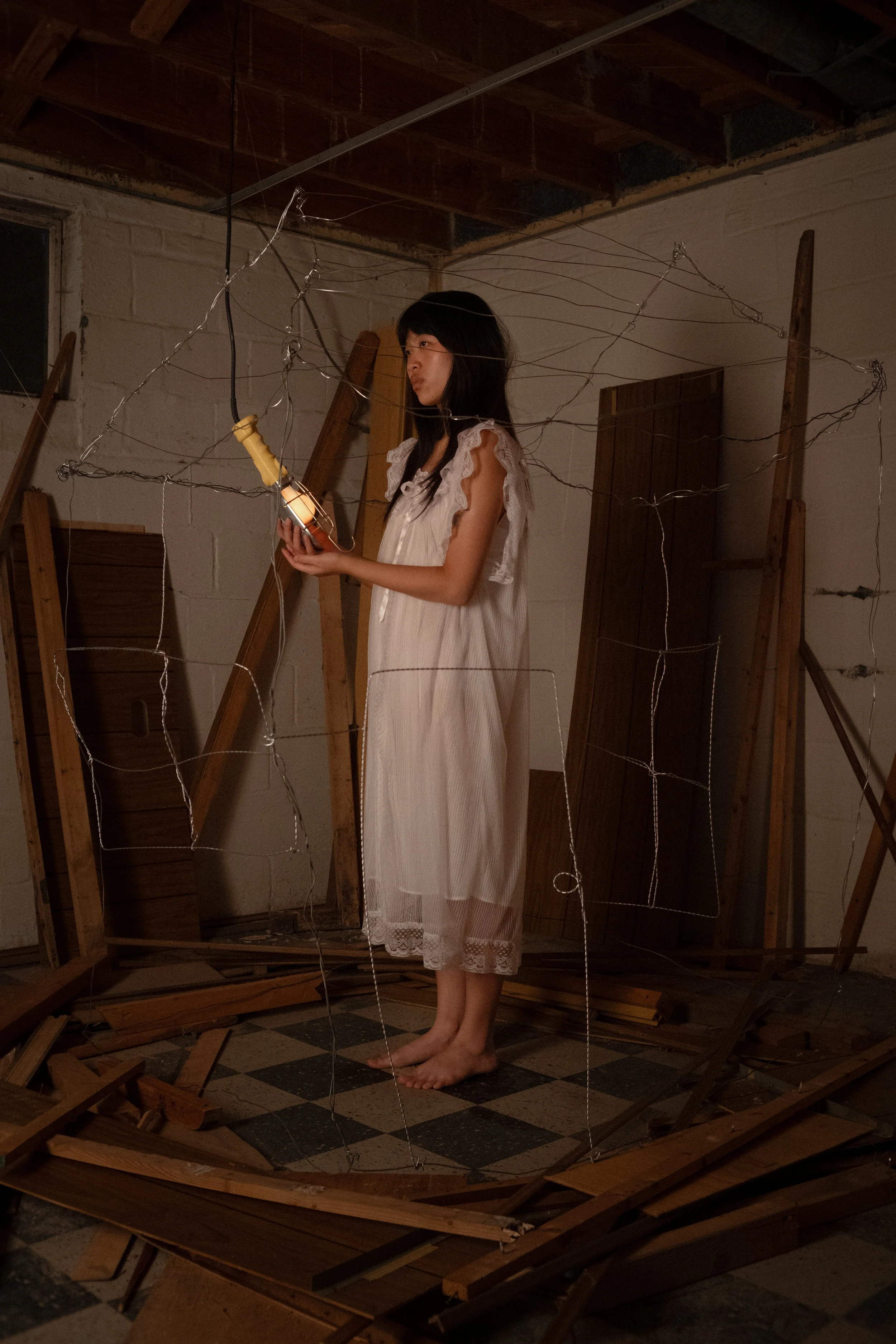 What is left is wire, bent and strung into the shape of a door, a window, the outline of a house. The house is now a vessel with no skin, a structure that holds nothing but its own memory of what it used to be. It sits inside another house, itself half-destroyed, the ceiling exposed, the floorboards broken and scattered. A house inside a house in ruins is a life cycle reaching its end. There is one light source, a single work lamp hanging from the ceiling, and a wooden stick, held upright like something between a tool and a staff. Electricity and wood: the most ancient and the most modern ways of saying “someone was here”, someone tried to make this livable. To be an immigrant is to be intimate with a particular kind of death, not of the body, but of the self. Parts of the person you once were are set aside - sometimes, for so long they stop being retrievable. For a new identity to take root in a new place, something else has to be put down. The wire house understands this: it has given up everything that made it a house (the walls, the warmth, the interior) and what remains is only the shape of what it was; the outline.