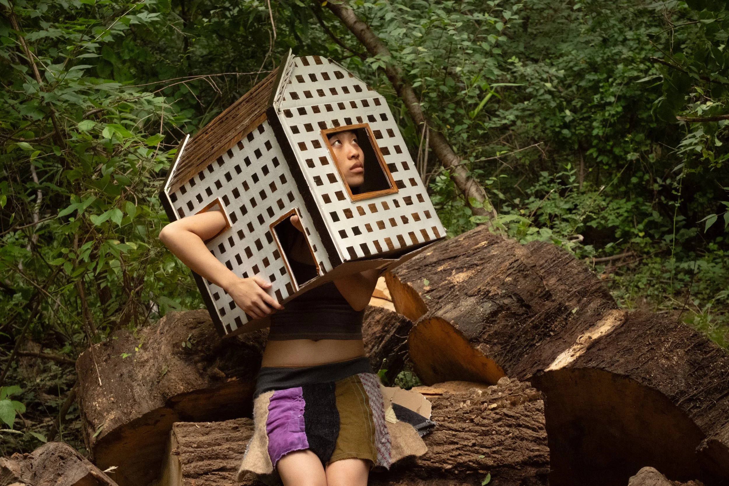 The next two houses use materials such as cardboard, patched cloth and leftover construction wooden planks chosen because they represent a particular state: the temporary that becomes permanent, the provisional that becomes the only structure you have. In the first image, the body wears the house. It sits tilted over the head like a crown that doesn't quite fit, and through the window, a face looks out. She is not trapped, yet not free- she is somewhere in between. The house is not protecting the body, the body is holding the house up. The costume, made by Vivian Nguyen, extends the logic of the house itself: patched cloth in different textures and colors sewn together, each piece from somewhere else.